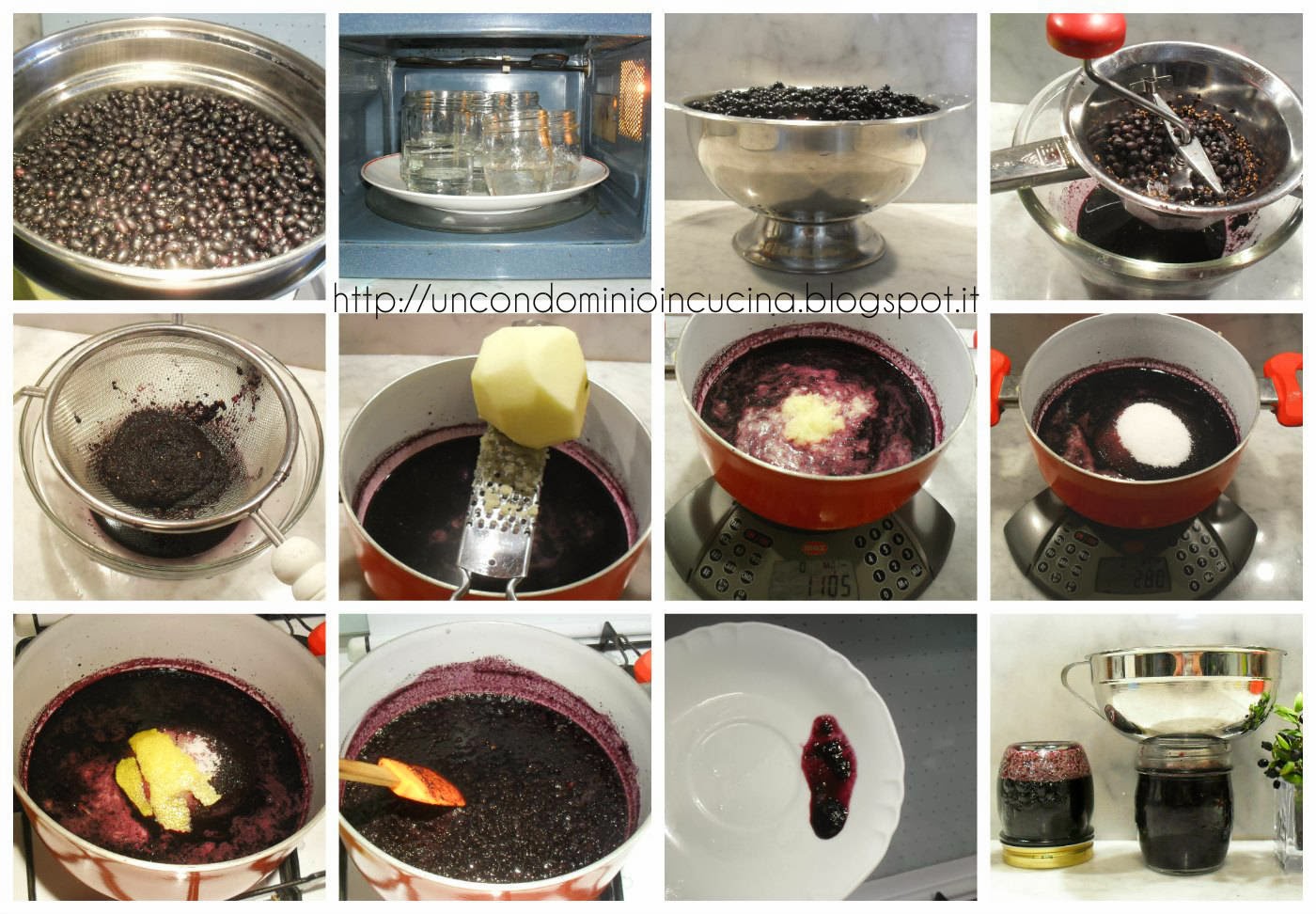 3 – Lavare le bacche, bollirle circa 15 minuti per ammorbidirle, scolarle, schiacciarle nel passaverdure, filtrare la composta ottenuta attraverso un setaccio per eliminare quanti più noccioli possibili (che contengono una quantità di tannini esagerata), aggiungere la mela grattugiata, pesare il composto, calcolare l’80% che è il peso dello zucchero da aggiungere, mettere sul fuoco, aggiungere la scorza del limone e la vaniglia, cuocere a fuoco lento fino a che la purea si addensa, fare la prova piattino congelato, se la marmellata non scende a velocità della luce ma  come un’anima in pena è pronta, eliminare la buccia di limone e l’eventuale baccello di vaniglia, indi invasare nei vasetti precedentemente sterilizzati al microonde (un dito d’acqua per 5 minuti alla massima temperatura), capovolgere i boccacci e, una volta freddi, rigirarli per dritto.