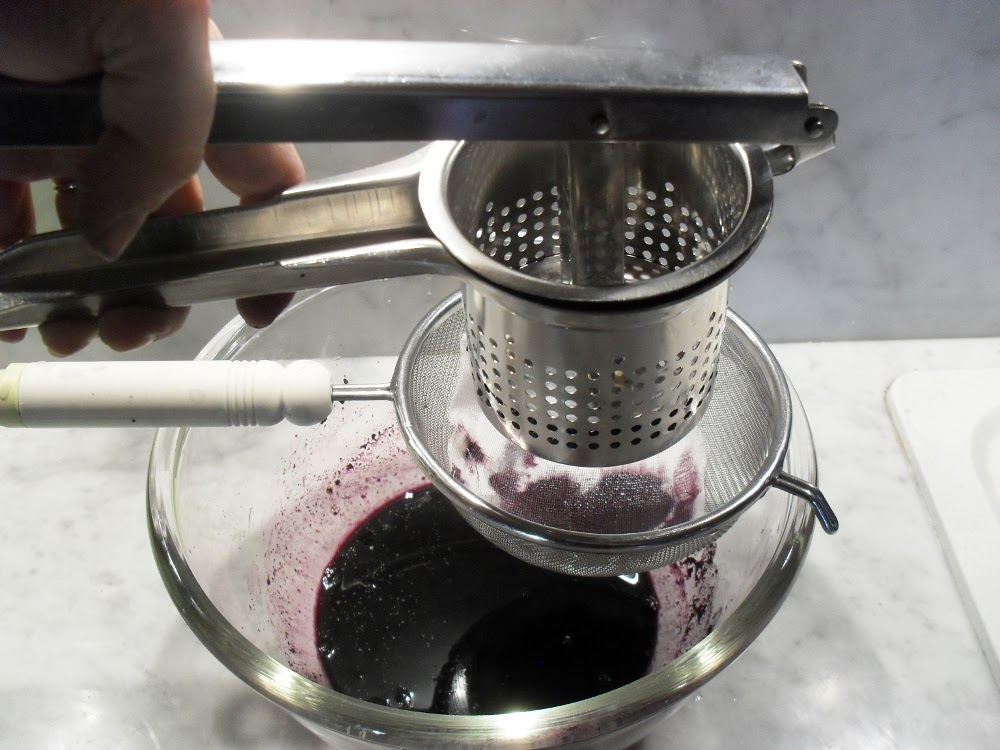4 bis – Allora, dicevo, bisogna ricavare quanto più alcool possibile assorbito dalle bacche, all’uopo sarebbe necessario un piccolo torchio, io ho usato lo schiacciapatate…. e ho schiacciato circa 2 chili e mezzo di bacche pregne di alcool…. evito di dirvi che significa sennò il mirto non lo farete mai!!! Schiacciare più possibile le bacche ma senza esagerare (?!), onde evitare di sprigionare troppi tannini dalla polpa, responsabili di un gusto esageratamente astringente e pizzicoroso. Raccogliere tutto l’alcool strizzato e filtrato (in carta assorbente o in telo pulito) in un contenitore e