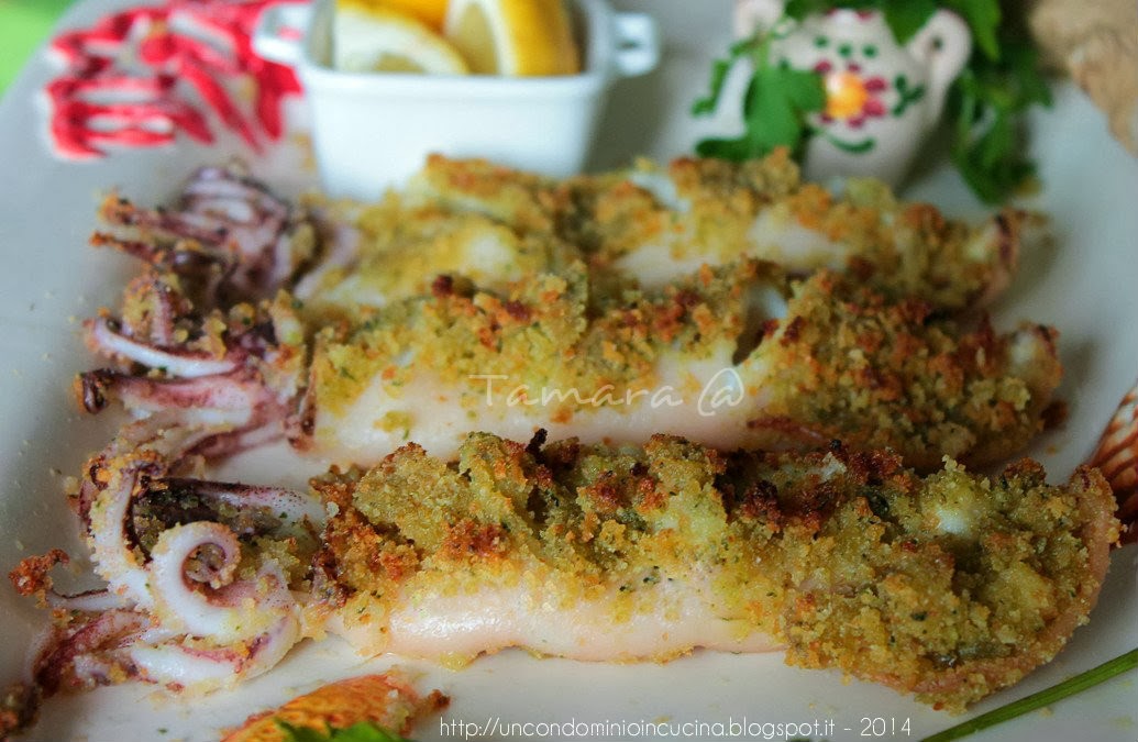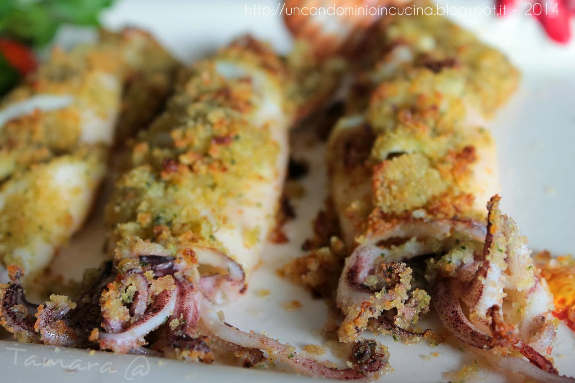 Questo è un piatto che faccio spesso, che mi viene richiesto sempre nelle cene ognunoportaunacosa, che non mi delude mai, che posso preparare in anticipo, che posso variare nel soggetto principale, che cuocio in modo diverso a seconda (eddaje!) di come mi gira, e, ultimo ma non ultimo (semmai, secondultimo….) buonissimo. A condizione di usare calamari freschi, e se possibile pane grattugiato fatto in casa. Se poi riusciamo anche a coltivare il prezzemolo e lo zenzero, e a torchiare l’olio dalle olive che abbiamo in giardino e a pescare i calamari….