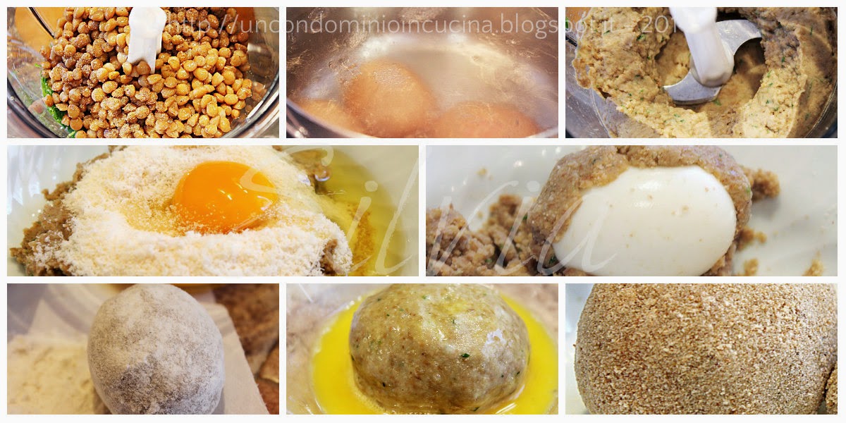 Amalgamare bene il tutto e ricopriteci le 4 uova facendo aderire bene il composto. Passare prima nella farina poi nell’uovo battuto (l’ultimo rimasto) e in ultimo nel pane grattugiato.