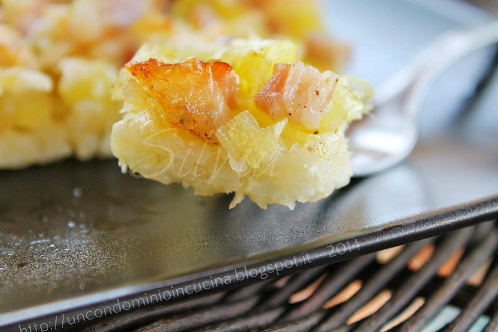 Trascorsi i 10′, prelevare il riso dal forno e cospargerlo di porri e bacon; spolverare con il gruyere rimasto e continuare la cottura sempre in forno a 190° per 15 minuti.