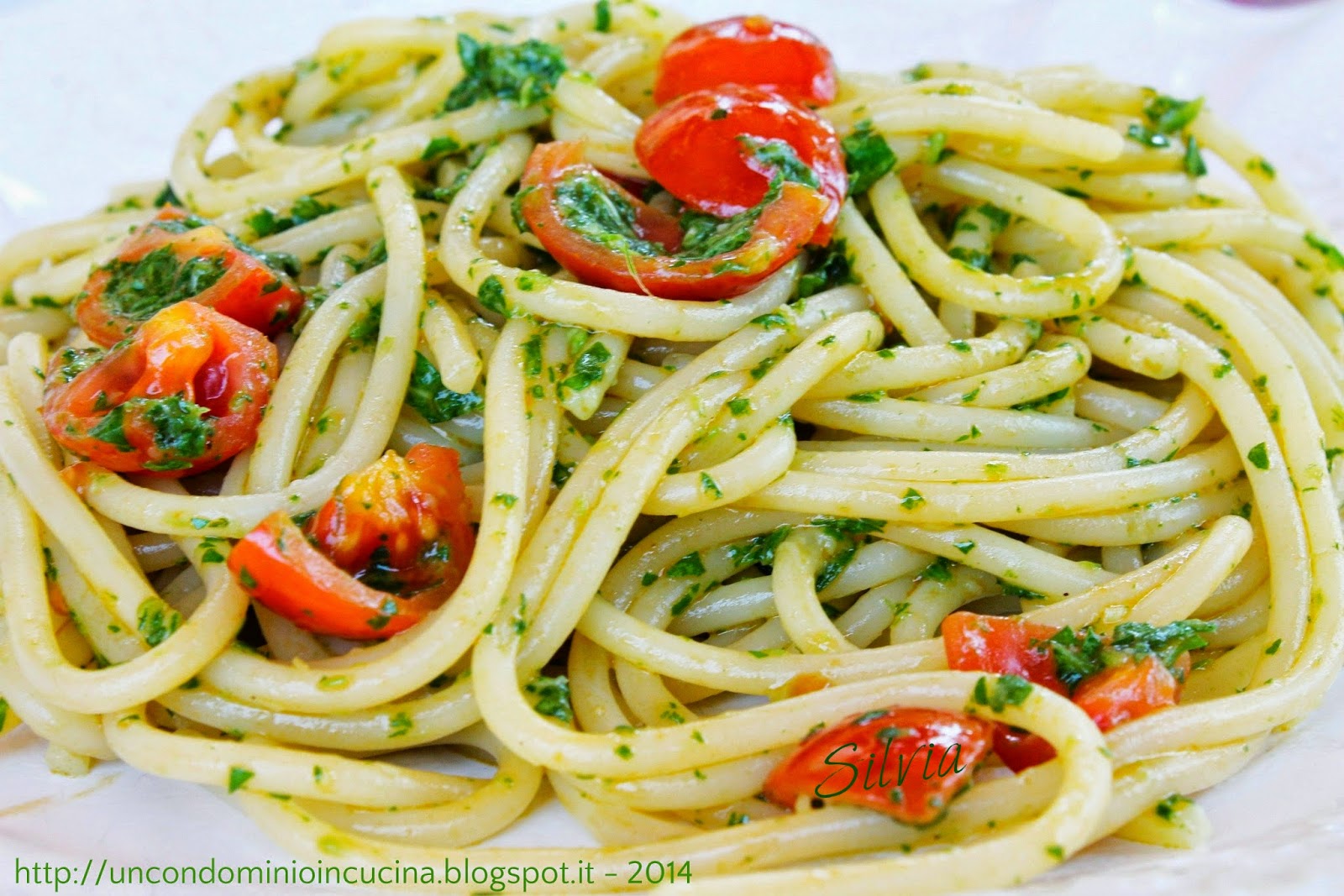 Cuocere gli spaghetti in acqua bollente salata, scolare e condire con il pesto preparato.
