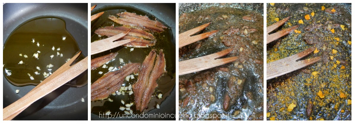Nella stessa padella (che poi è quella che useremo per condire gli spaghetti), versare l’olio e far soffriggere l’aglio, (quello che prima abbiamo tagliato sottile sottile sottile) senza aspettare che prenda troppo colore; aggiungere i filetti di acciuga precedentemente dissalati e sciacquati e lasciar cuocere fin quando si saranno completamente sciolti, creando una sorta di salsina. Nel frattempo anche l’aglio si sarà rosolato al punto giusto!