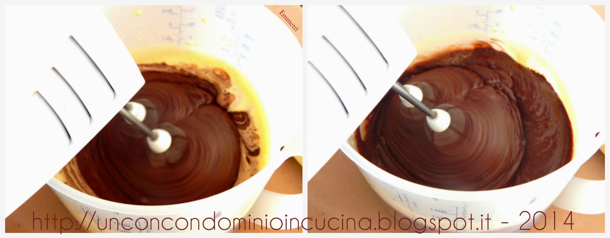 Vi accorgerete che, mentre mescolate, il composto di uova/zucchero e cioccolato/e burro prenderà una certa consistenza e una golosa cremosità (non pucciate il dito per assaggiare, per carità!!).