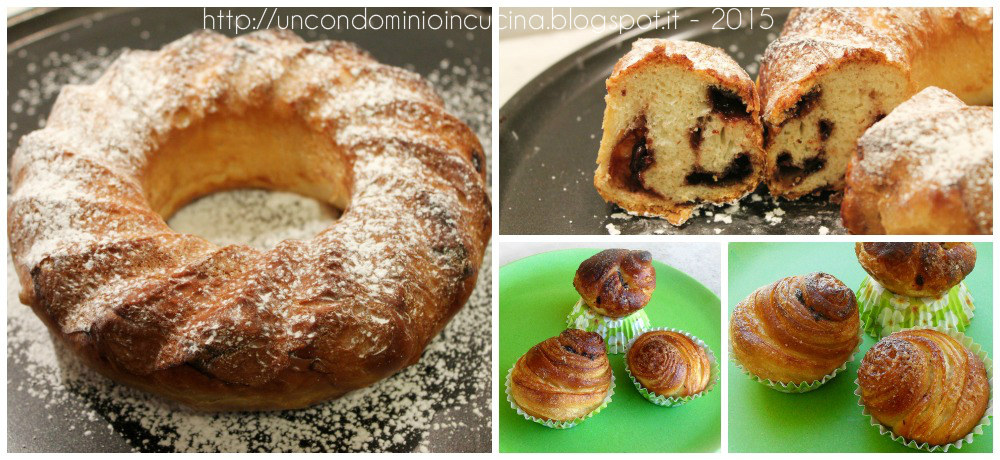 Ecco, con quegli scarti ho fatto una ciambella lievitata. Ho conservato, via via che laminavo, gli scarti in pellicola alimentare, finita la terza piega li ho reimpastati così da far assorbire alla farina qualche residuo di burro, ho steso l’impasto in un rettangolo, farcito con marmellata e gocce di cioccolato, arrotolato, chiuso e posato in uno stampo in silicone. Fatto lievitare fino al raddoppio ed infornato per 35/40 minuti.