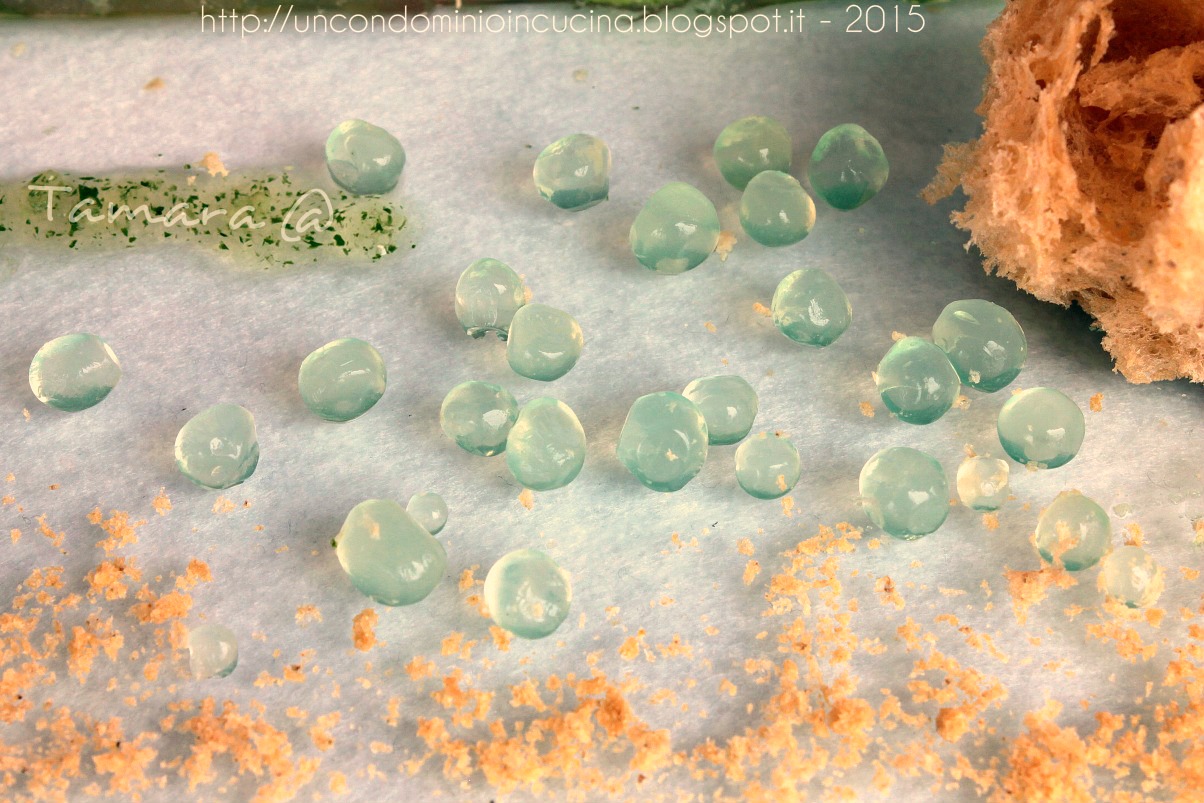 – Prelevare il liquido con una siringa da pasticciere e versarlo, goccia a goccia, nell’olio freddissimo. Le gocce manterranno la loro forma, e, a contatto con l’olio freddo, gelificheranno. Quando avranno raggiunto il fondo saranno pronte per essere scolate e lavate sotto acqua corrente per eliminare l’olio.