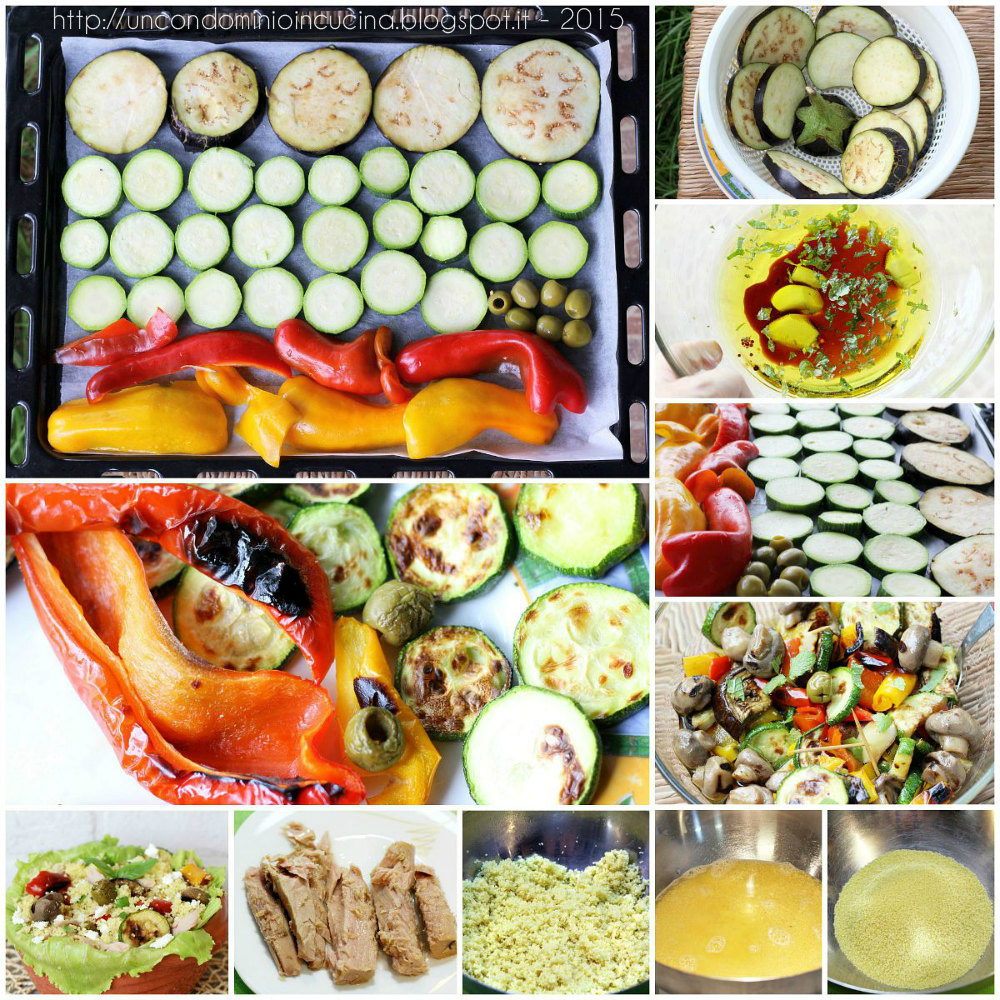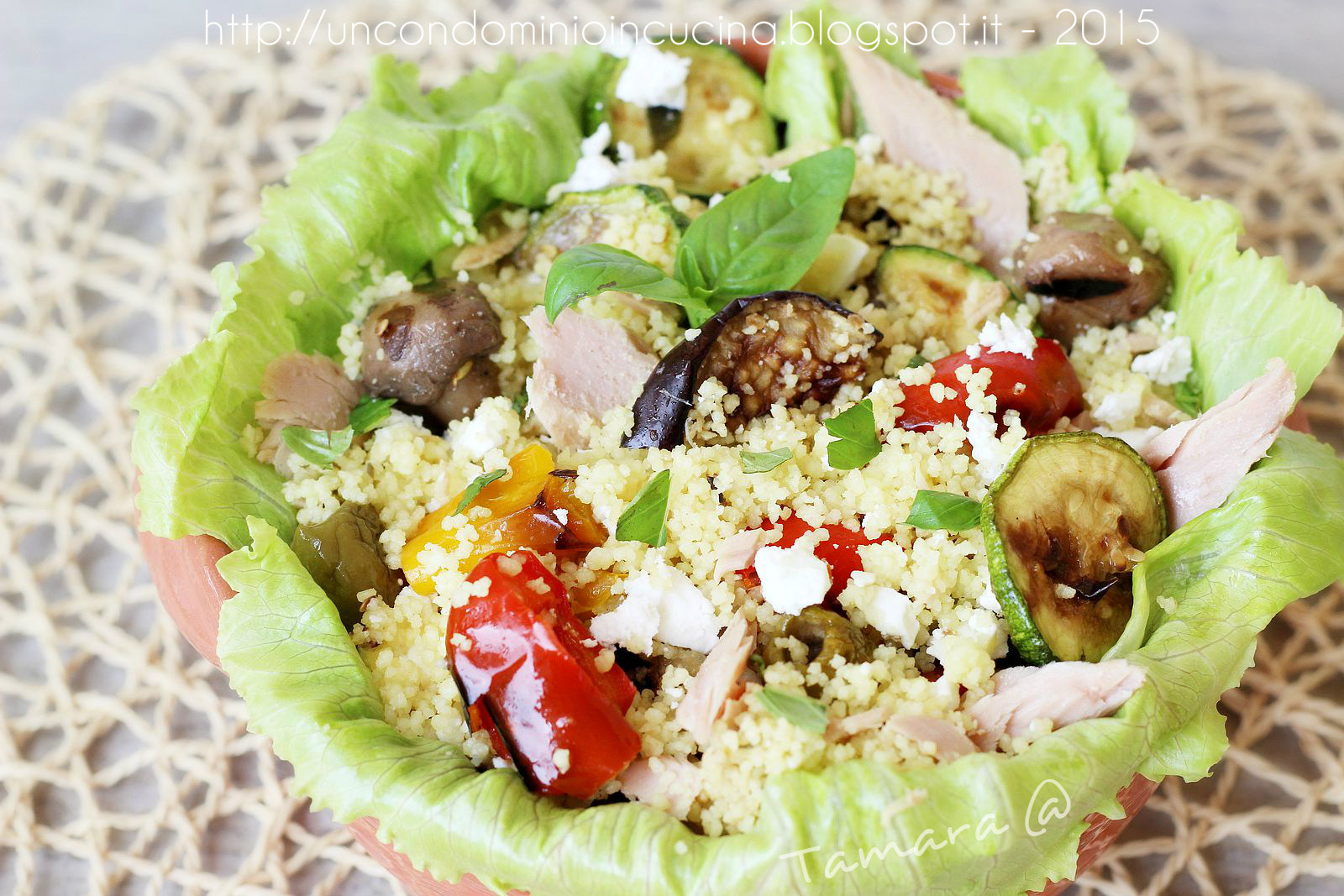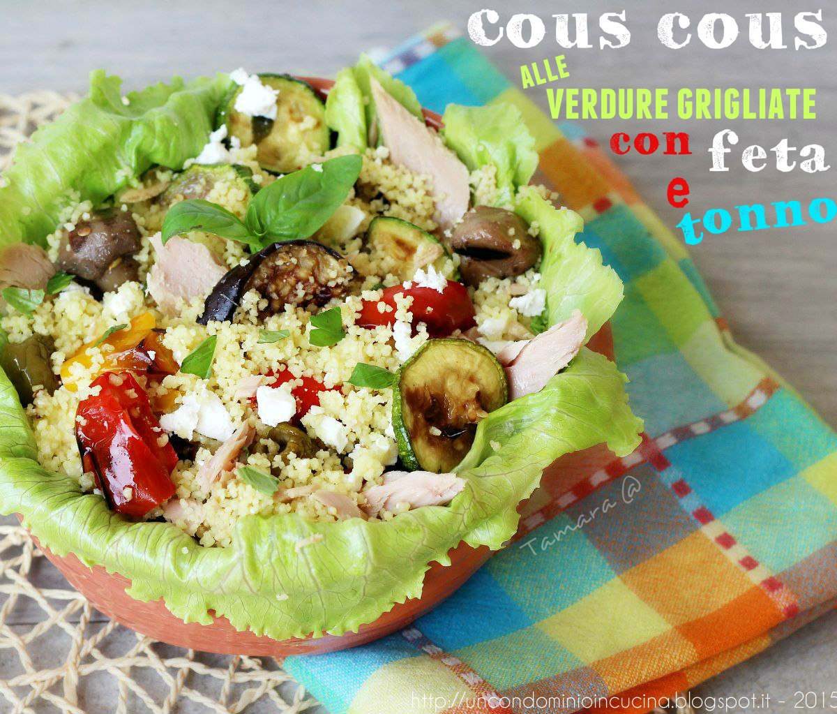 Cous cous alle verdure grigliate, feta e tonno. Volendo si può evitare anche di grigliare le verdure, comprarle sott’olio ma di ottima qualità, oppure fare come me, che grigliavo in anticipo la sera in un’unica infornata e poi dritta sotto la doccia!