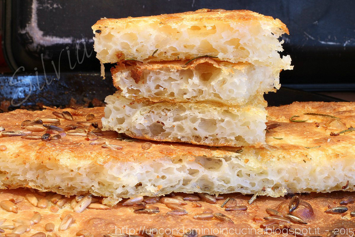 La focaccia ha veramente un gusto e una mollica particolari. Il sopra e il sotto sono scrocchiarelli e la mollica è spugnosa, gelatinosa e leggerissima!