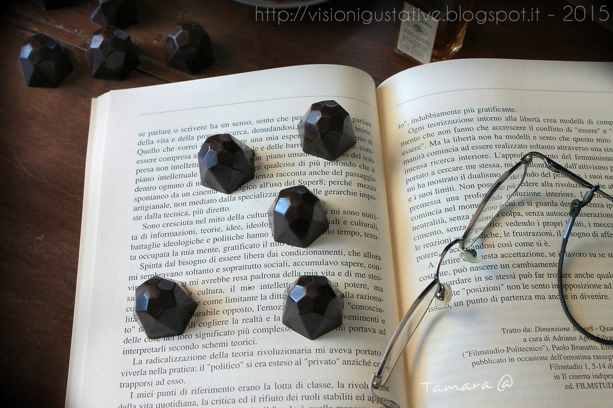 Così ho cominciato a studiare (continuando a sbaf… degustare cioccolatini), ho praticamente imparato a memoria il trattato sui cioccolatini di Piero (che consiglio vivamente di leggere e consultare a chi volesse cimentarsi per la prima volta con temperaggio-colatura-copertura-smodellamento-smadonnamento) e li ho fatti e rifatti più volte, arrivando alla mia ricetta perfetta, al mio gusto prediletto (per ora!), una fusione di due ricette, sempre di Piero, rubate qui.