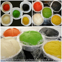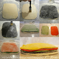 Stendere il panetto nero, sovrapporlo a quello bianco, spennellare d’acqua e procedere allo stesso modo con l’impasto verde, rosso ed infine giallo.