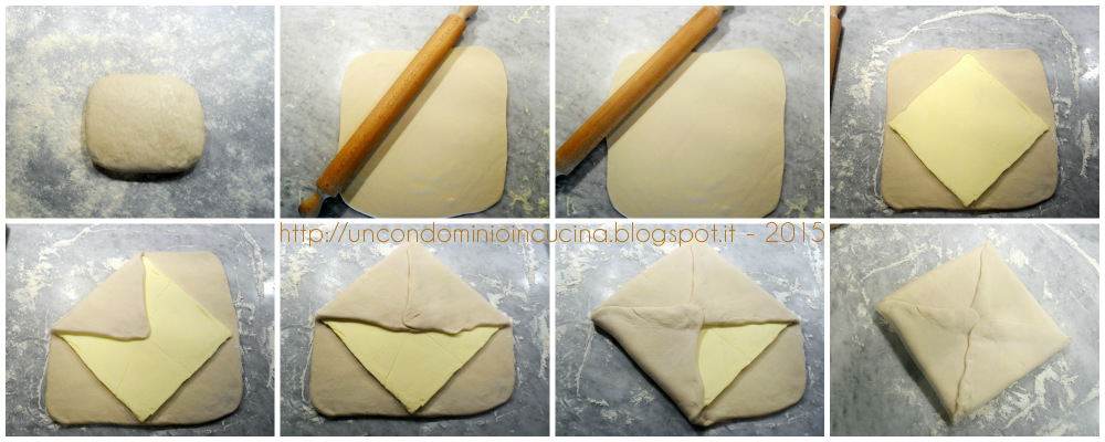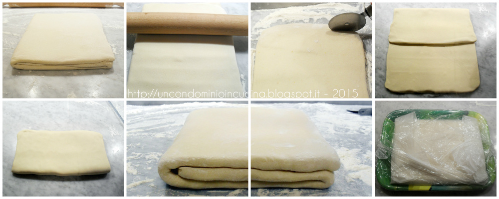 • Prima di ogni piega rifilare i bordi in cui il burro non sia stato incluso, così che ogni parte dell’impasto sia ben laminato. Con gli avanzi si posso fare delle brioche.