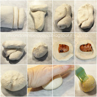 – Schiacciare la pallina, poggiarvi al centro un pezzo di salsiccia (se si vuole porcheggiare esageratamente, spennellare previamente la salsiccia con marmellata piccante, ketchup o senape), richiudere a palla, arrotondare facendo roteare la palla (da qui l’espressione “mi stai facendo girare i cabbasisi!”) sotto il palmo della mano.