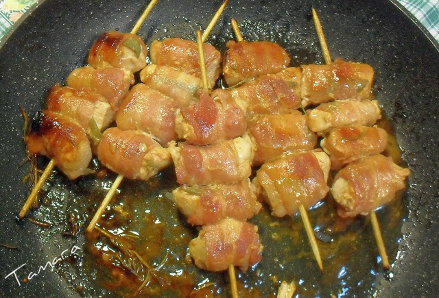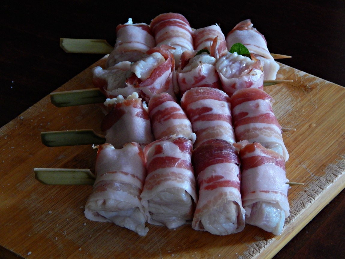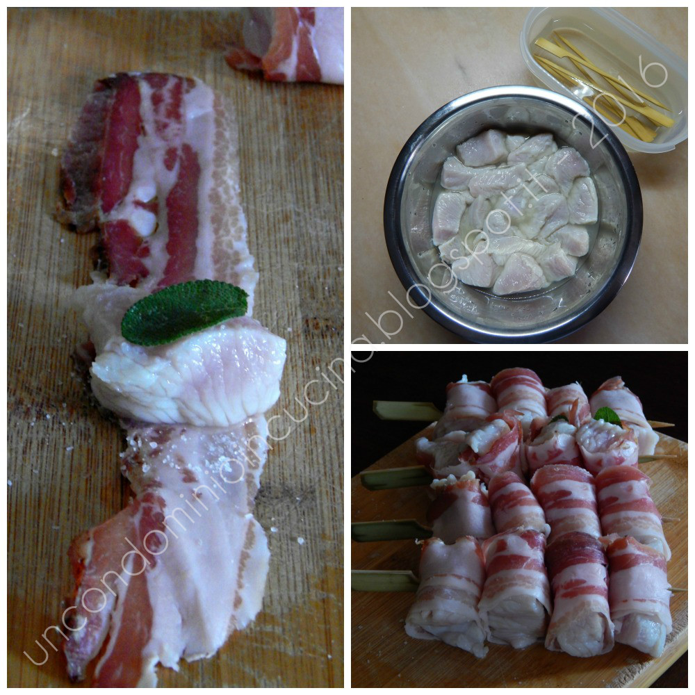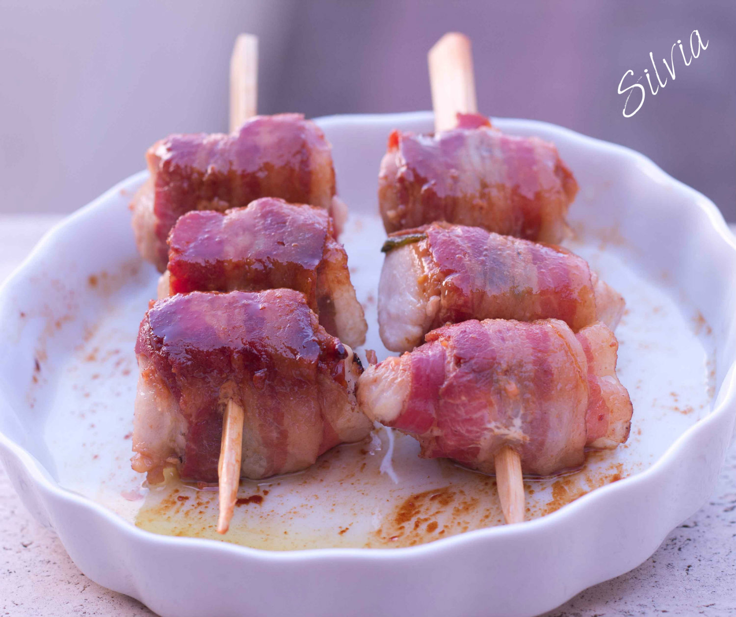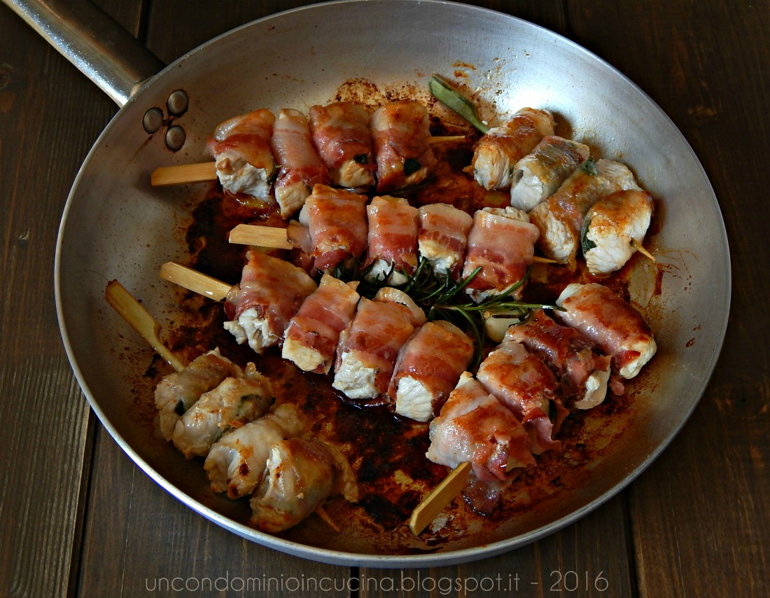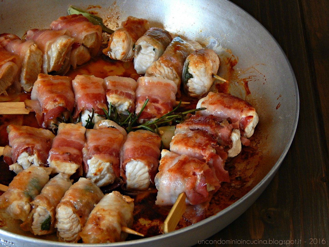 Spiedini di carne bianca, marinati prima nel limone e poi avvolti da una fettina sottilissima di pancetta insieme a foglioline di salvia.