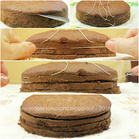 – Poi con un filo di nylon o spago da cucina molto sottile avvolgere la torta inserendo il filo nel primo taglio praticato sul fianco della torta, incrociare i capi, tirare e stringere delicatamente fino a quando lo strato non sarà completamente tagliato. Procedere allo stesso modo per tutti gli strati.