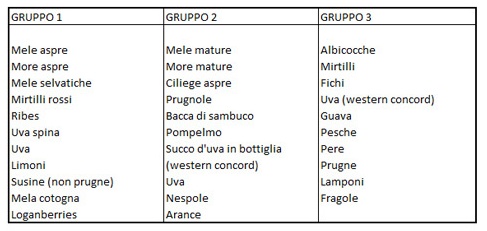 Ecco una comoda tabella che raggruppa alcuni frutti a seconda del loro contenuto di acidi e pectina (fonte: National Center for Food Preservation):