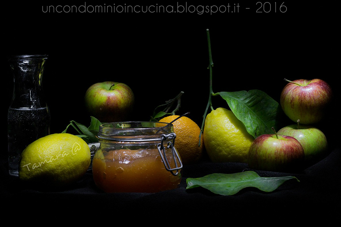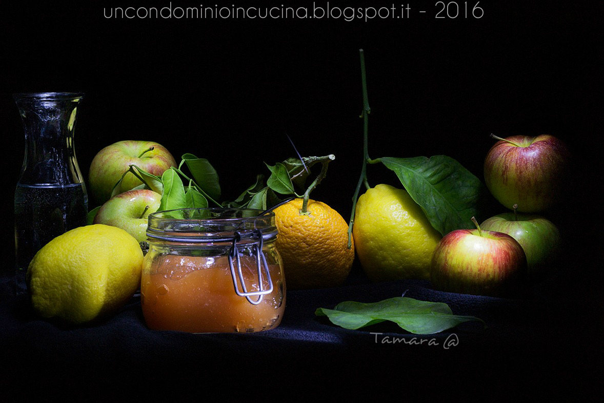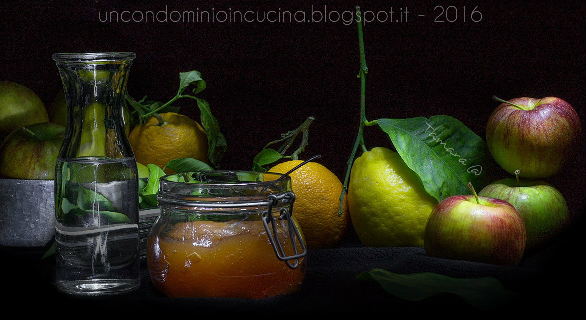 Lavare bene benissimo tutti i frutti, sbucciare l’arancia e i limoni e trattenerne le bucce compreso l’albedo, pelare le mele grossolanamente (trattenendo un po’ di polpa con la buccia), ricavarne i torsoli e tagliarli a pezzi.