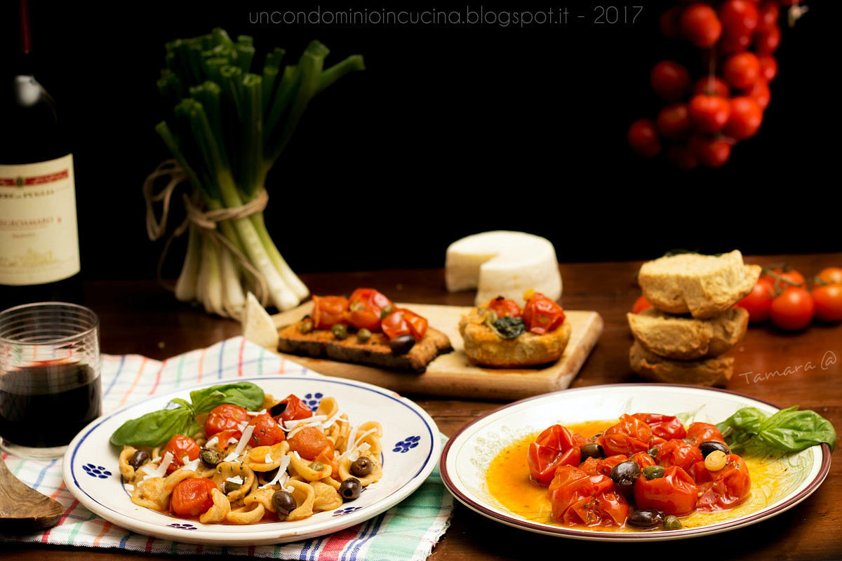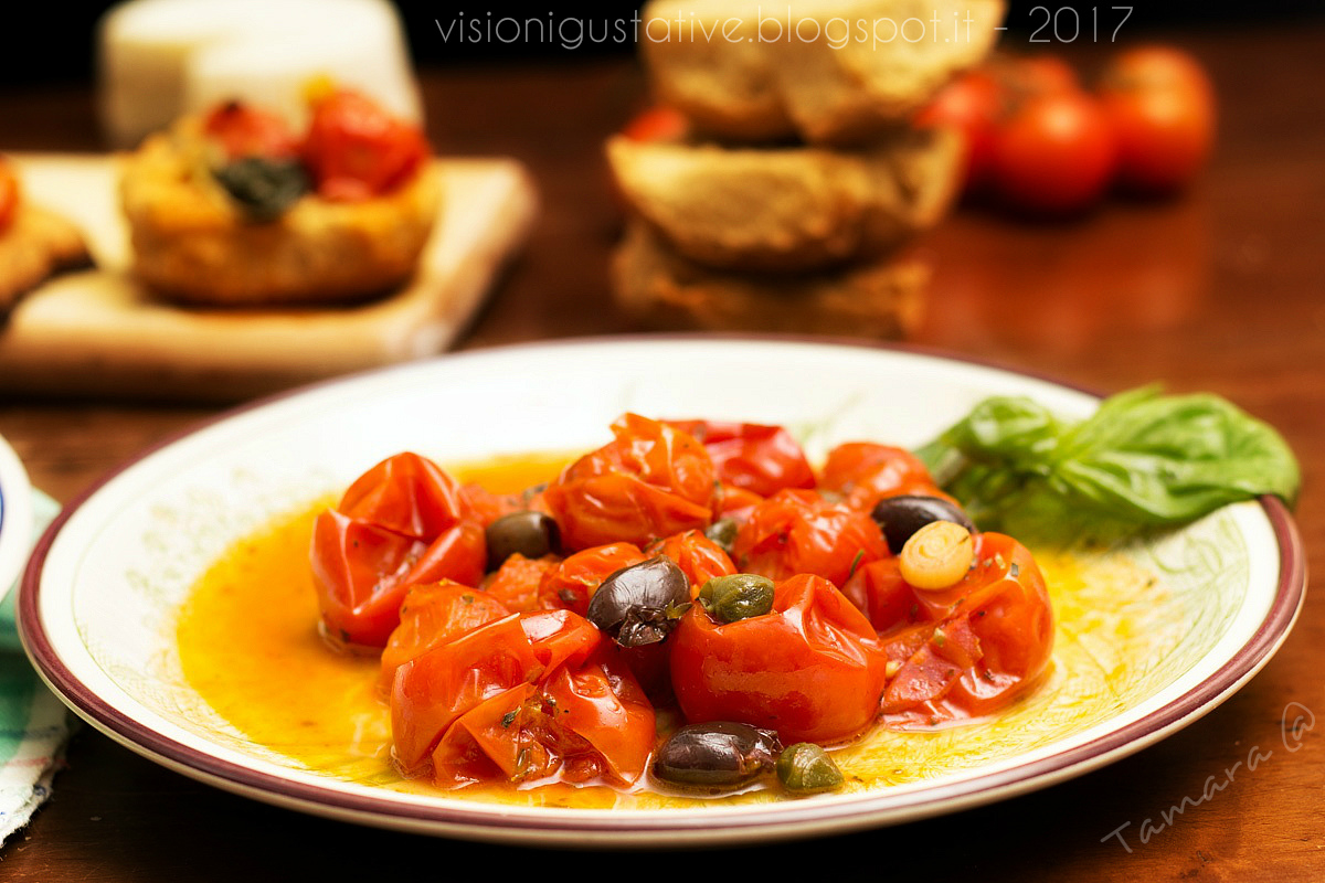 Li pummitori scattariʃciàti sono una prelibatezza che affonda le origini nella tradizione della cucina contadina scelta spesso come piatto unico nella veloce pausa pranzo tra un lavoro a campagna e l’altro. In genere, li pummidori scattariʃciati venivano consumati su fette di pane raffermo oppure come condimento delle immancabili friselle, per dare un po’ di sostanza ad un piatto povero, sia pur gustoso. Io a campagna non ci vado, però li pummitori scattarisciati li cucino lo stesso, quando ho fretta, poca fantasia oppure quando la bilancia la mattina mi dice “l’importante è la simpatia”!