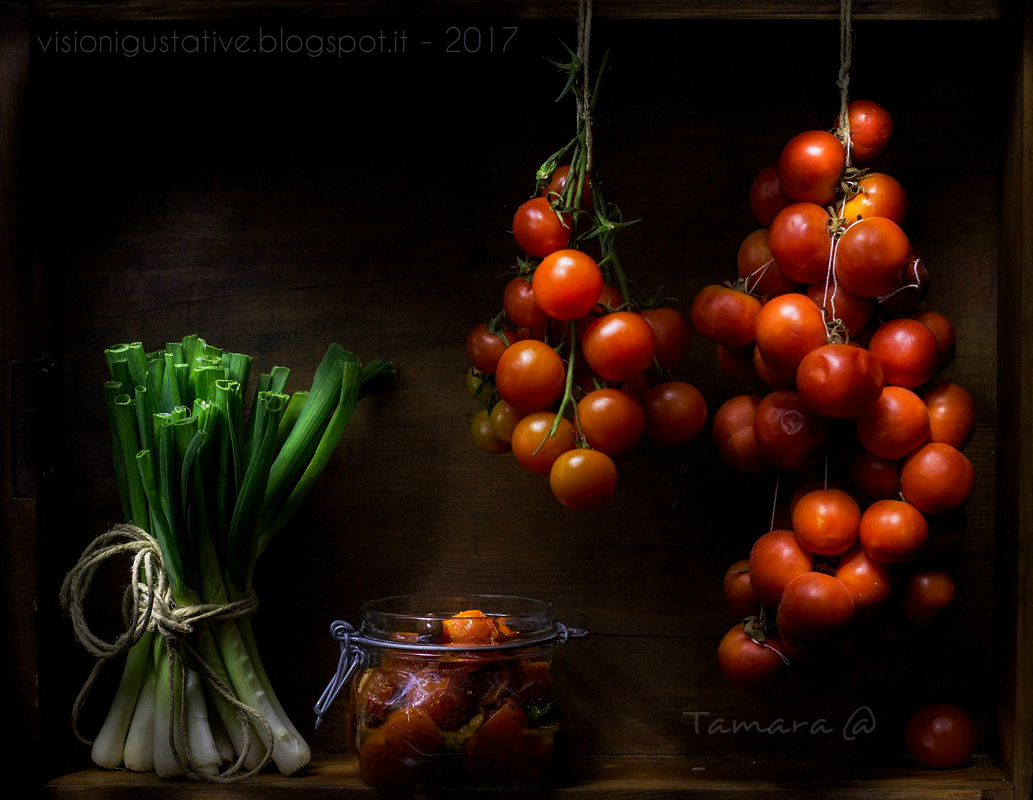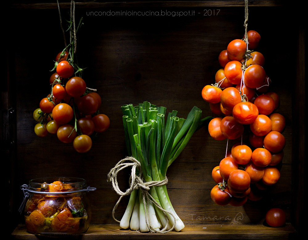 Li pummitori (o prummitori) sono i pomodori, preferibilmente quelli invernali, gialli, appesi, ma anche pachino o ciliegino vanno bene.