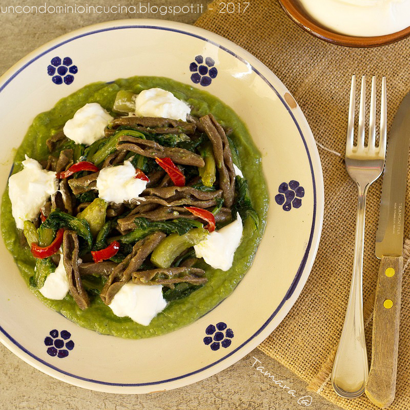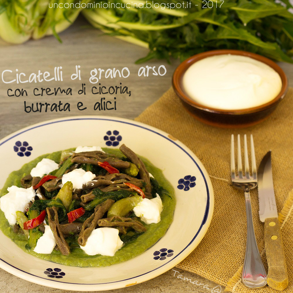 Cicatelli di grano arso con crema di cicoria, burrata e alici e ogni scarrafomamma è bella a figlia soja