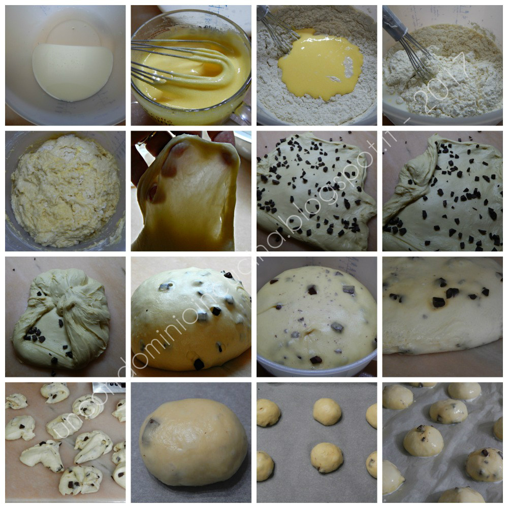 Alla ricetta ho apportato qualche piccola modifica: ho ridotto la quantità di farina manitoba a favore della zero per aumentarne la sofficità; ho messo un uovo intero anziché due tuorli per far sì che l’impasto tendesse più ad un pane che ad una brioche, ed infine ho ridotto lo zucchero, con la certezza che la presenza del cioccolato avrebbe compensato e riequilibrato tutti i sapori.